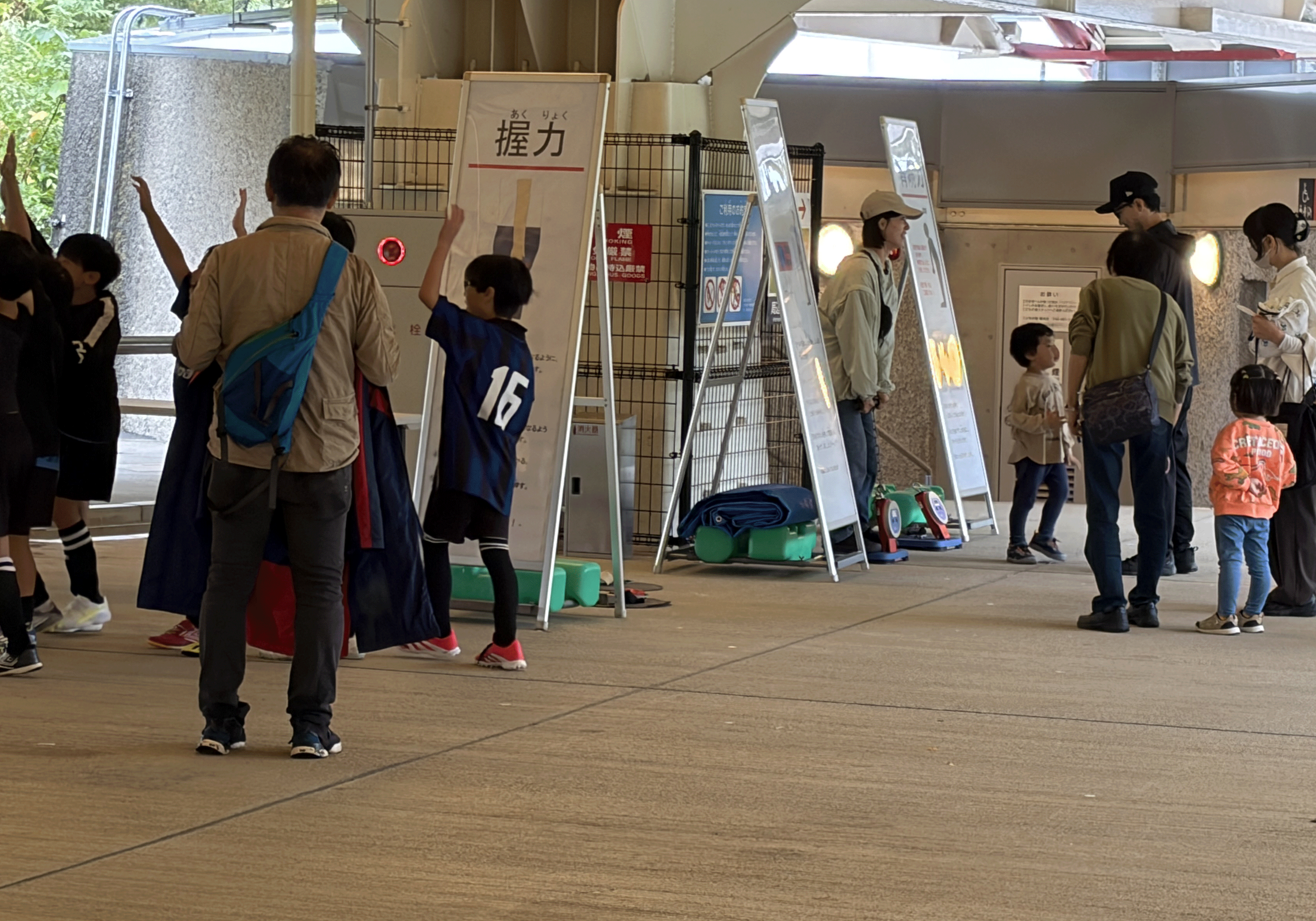 体力測定では握力測定、背筋力測定、ジャンプ(垂直跳び)力測定がありました。おとなもこどもも一緒になって自分の数字を測っては家族と比べたり、平均と比べたりして、自分の力の強さがどれくらいなのか知る機会となりました。