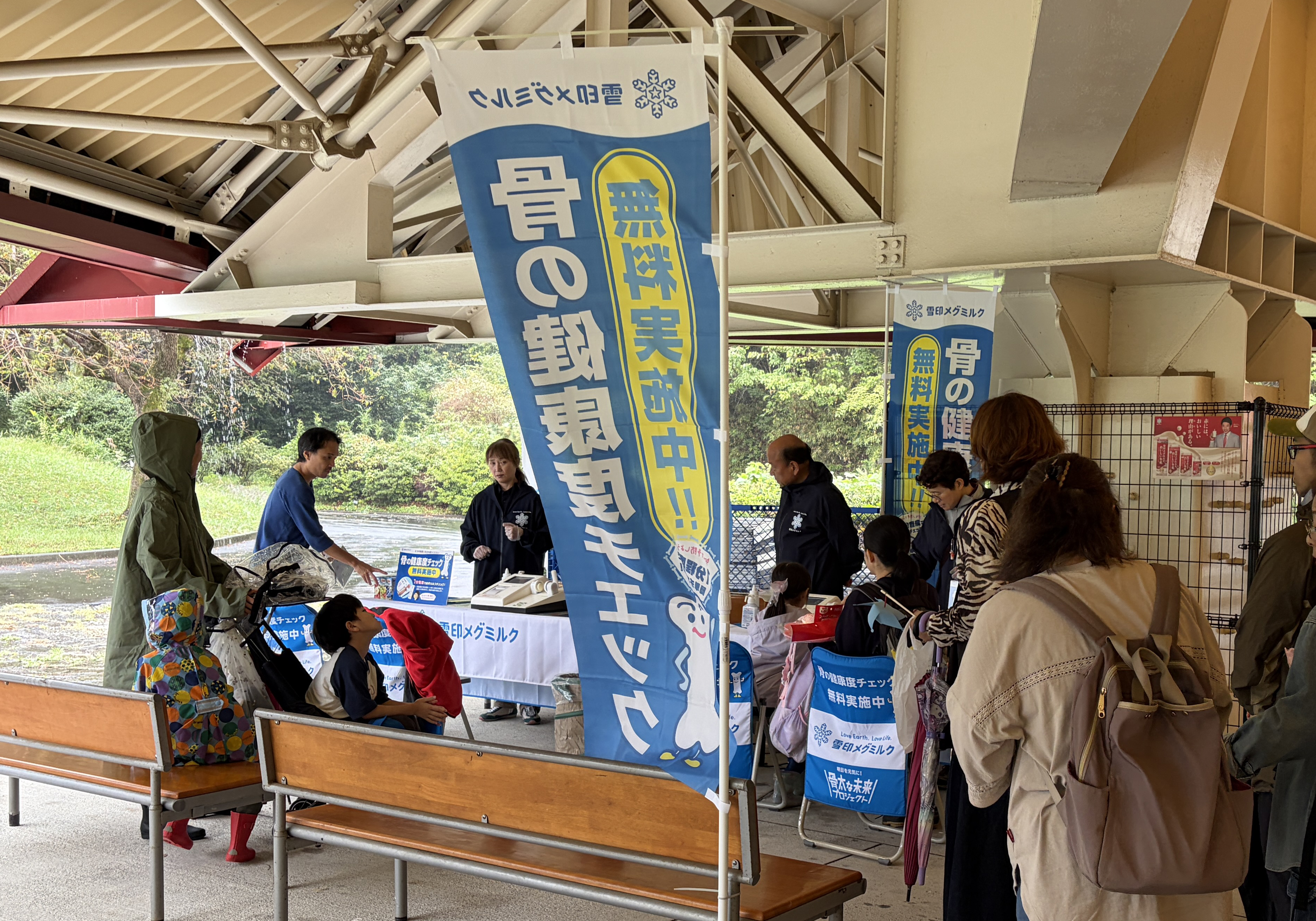 今年はこどもの国開園60周年を記念した秋まつりを予定していました。雨天のため、体力測定や骨の健康度チェックは、会場を中央広場から記念館の屋根の下に場所を移動して行われました。