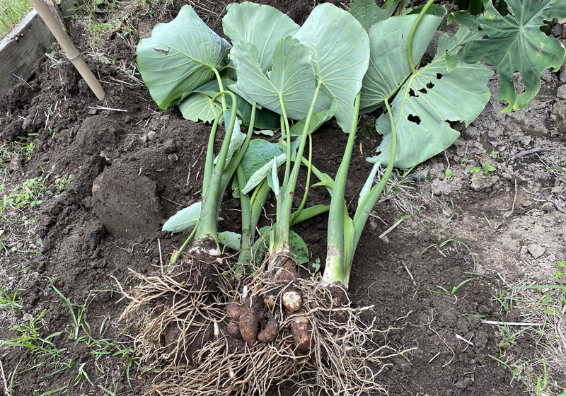 収穫の際は親イモ、子イモの外側をスコップで大きく掘りイモを傷付けないように茎の下まで掘って土ごと持ち上げ収穫します。