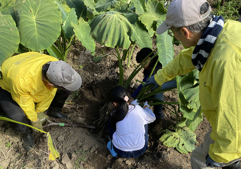 サトイモは多くの人に参加していただくイベントとするには栽培や収穫に多くの課題がありましたが、大きな葉っぱは「となりのトトロ」でおなじみだが、「土の中でどうなっているの?見たことがない」との多くの子どもたちの声を聞き、実際にサトイモを収穫してもらうため、60周年記念特別イベントとして実施しました。