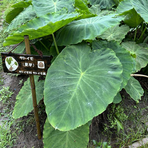 これらイベント開催時にサトイモの大きな葉っぱを見てもらうため畑の隅に栽培してきました。