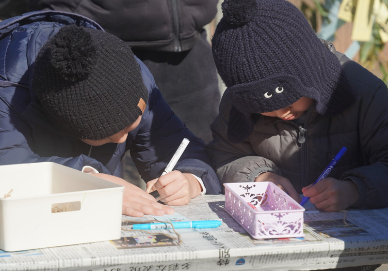 点火時間の午後1時までは短冊に1年の願い事を書いたり、やぐらにお飾りをつけたり、コマや羽子板などのお正月遊びをしたりして過ごす方が多くみられました。