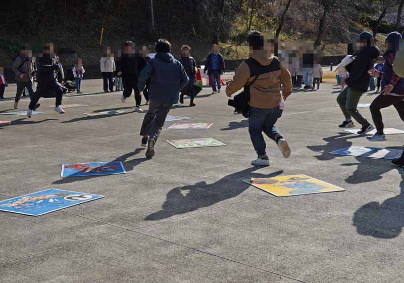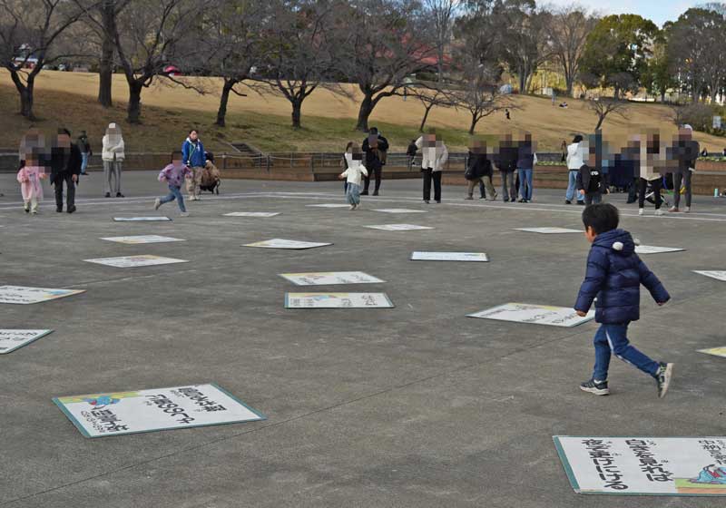 1m四方のカルタを大人やこどもに分かれて取っていきます。