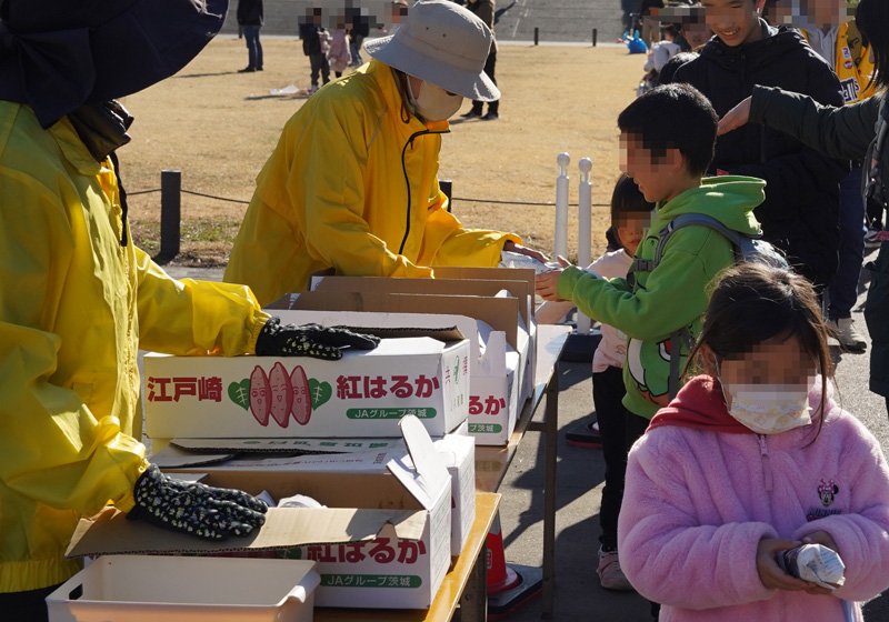 13時30分から整理券を受け取ったこどもたちに焼き芋の配布を行い、