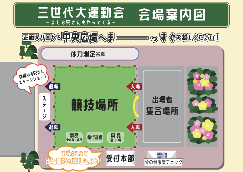 参加方法: ※各競技ごとの列に並んでもらい、登録が終わればチケットをお渡しします。チケットを持って参加競技の15分前に集合場所までお集まりください。